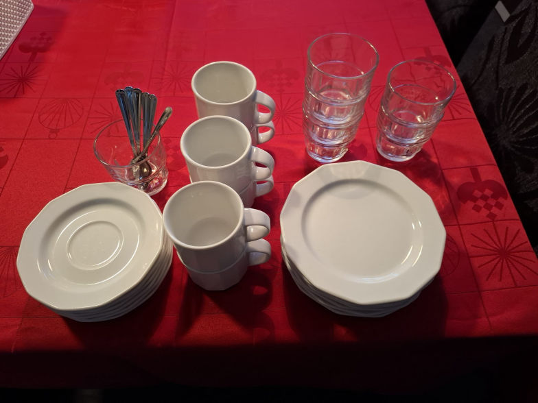 matalat ja keittolautaset, juomalasit,